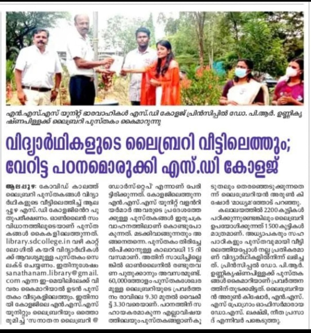 Covid 19 pandemic situation has affected library usage of college students. To overcome this situation, the NSS unit of S. D. College, Alappuzha has come forward and launched an initiative